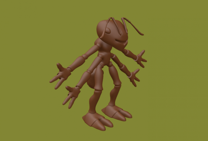 Ну вот мой вариант. Задачу ставил сделать не мультяшного героя, а более менее корректного с анатомической точки зрения муравья. За основу брал всеми любимого жнеца. Вот что получилось: