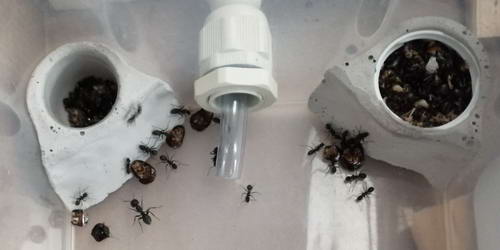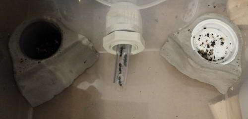 Экты растут. Сейчас рабочих уже больше 50. Расплод на всех стадиях. Прекрасно едят и довольно быстро растут. Теперь на арену выходит не 1, не 2 рабочих. А уже штук 6-8. Кстати фуражировка у них происходит в основном утром или в обед. Ближе к вечеру на арене почти не появляются. Так же заметил недавно очень интересную особенность в их поведение. Они, как и другие "понероморфы" не имеют возможности запасать в брюшках жидкую пищу. По этому они используют другую тактику. Они переносят жидкости в своих жвалах. Собирают в капельку и располагают между жвал. И таким образом транспортируют в гнездо. Выглядит очень необычно, так как у других своих муравьев такого я не замечал никогда.