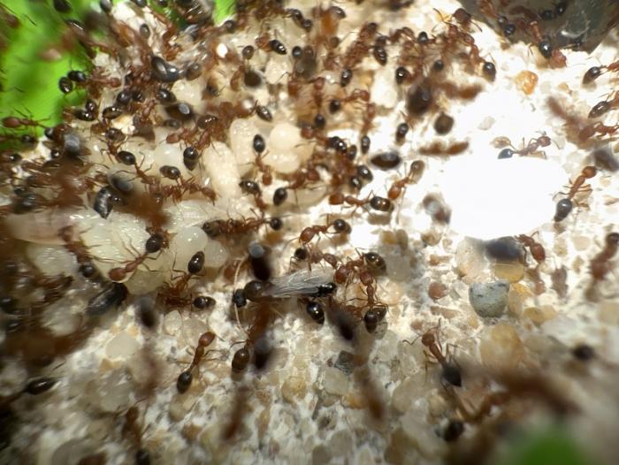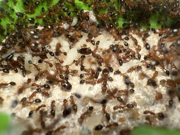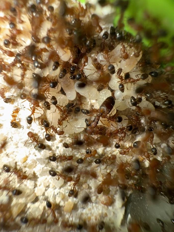Итак в конце августа мне посчастливилось побывать на Крите, пробыл я там почти 2 недели, за эти 2 недели я успел застать 3 переселения, 1 лёт и кучу муравьев. Но самое классное, что я оттуда привез это, конечно, monomorium bicolor. Это мелкие муравьи, но они будут раза в 2 крупнее фараонов, также они имеют оранжевый торакс и голову, брюшко блестящее, черное. Матки очень похожи на маток фараонов, но так же где-то в 2 раза больше. Также насколько я успел заметить, биколоры имеют жало(так же как и фараоны) и его используют(это конечно не огненные с их жалом, но все же). У биколора также как и у фараонов есть внутригнездовое. Ну и теперь самое интересное. Нашел я их во время деления главного гнезда. В итоге поймал 15 маток и под сотню рабочих. Ловил самым банальным, но самым проверенным способом, ватка и салфетки. Скидывал всех в контейнер промазанный вазелиновым маслом. После переселил всех в пробирку, заткнул ваткой, в пакет с ватой и в багаж. После приезда я сразу переселил их в формик, но из-за того что я не привык к таким магазинным формикам я не справился с увлажнением(а поилку же я конечно не поставил) и 1/3 рабочих умерла. Сейчас семья полностью оправилась, хороший пакет яиц и уже несколько десятков маленьких личинок. Едят мелких мертвых тараканов и пьют сахарный сироп. Так же они очень любят делать запасы как фараоны или кремы, перемолоть все в труху и хранить в сухом месте. Формик стоит под термоковриком что бы не было конденсата. Так же все щели я заклеил скотчем.