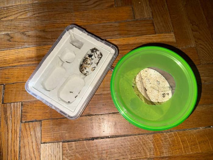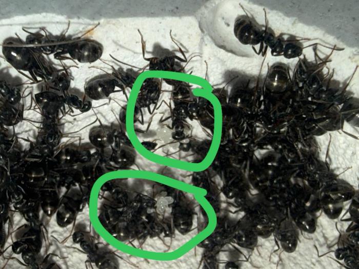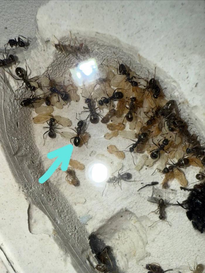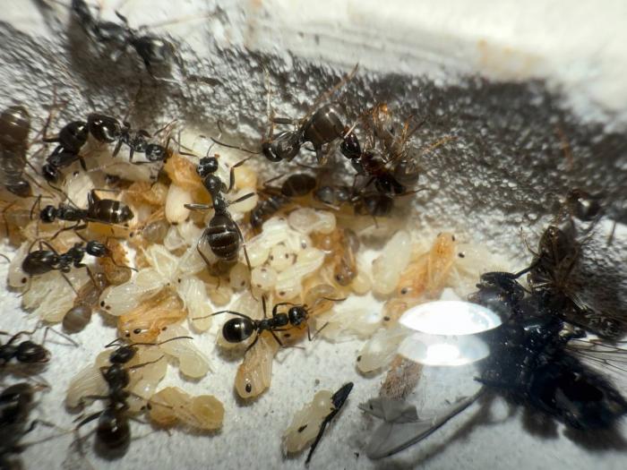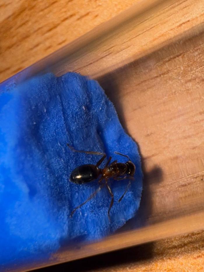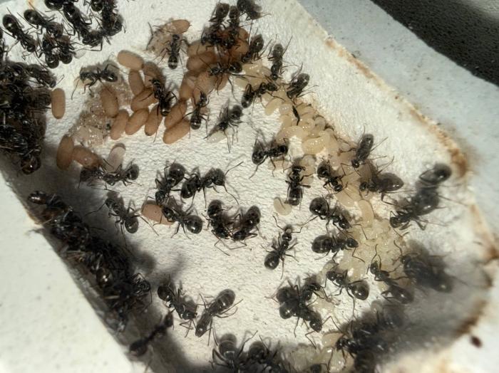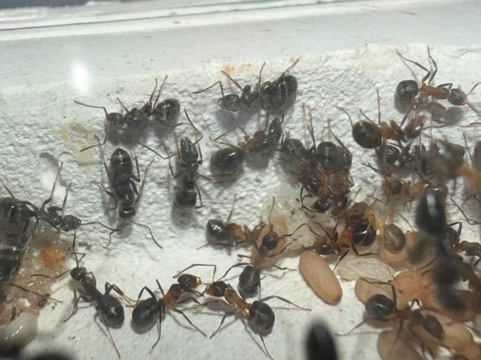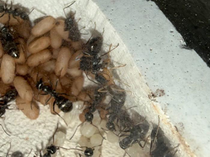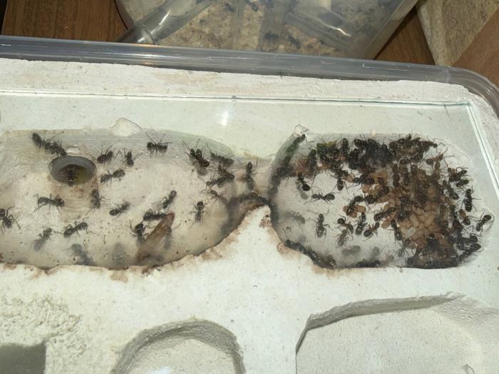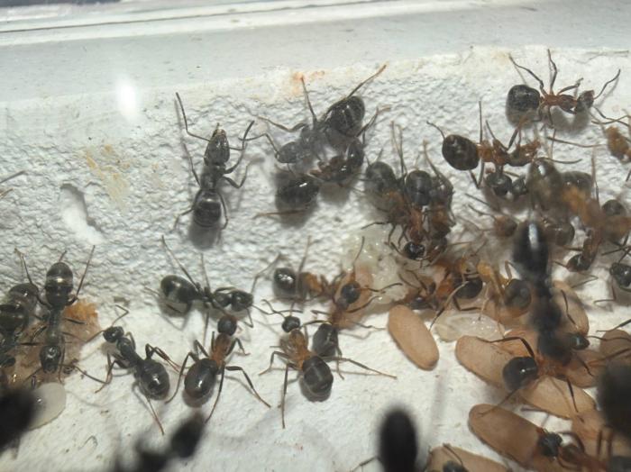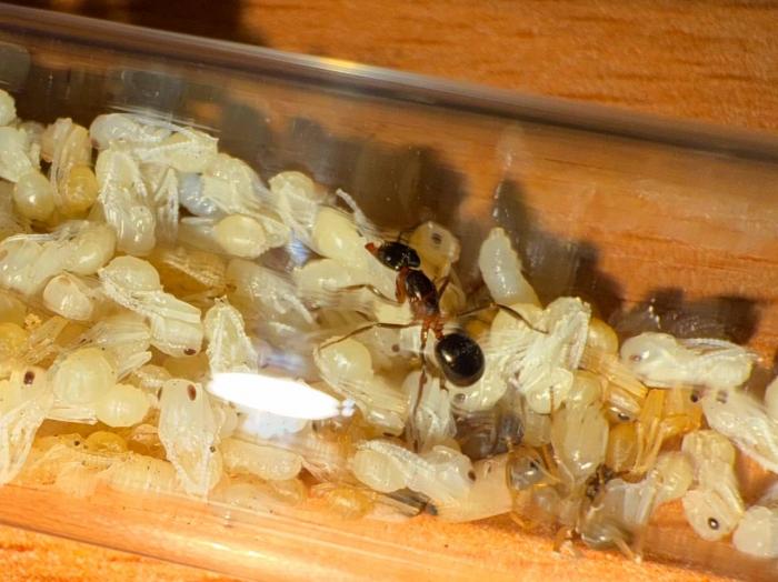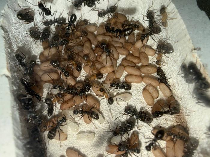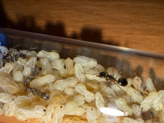 Как уже было сказано в название блога, копты довольно редкие муравьи. Особенно учитывая мое место жительства. Так как же я все таки нашел их? А все получилось очень банально, поехав отдыхать в город возле гор, случайно во время прогулки 10 августа 2025 года, я заметил что-то крошечное, подумал, что может это рабочий сервиформики, но передвигался он довольно нетипично, больше походило на передвижения самки. Я присмотрелся и увидел что и вправду, это самка. На тот момент я не был уверен, что я вообще поймал. Но вскоре покопавшись на просторах интернета, я понял что у меня коптоформика. А вот какая, я не знаю до сих пор. Но сейчас не об этом. После приезда домой, я сразу же пошел искать коконы/куколки сервиформик, ибо их мне было нужно ой как много(с той же поездки я привез 2 трункорумов, 1 пратенсиса и 2 раптиформик). Нашел я тогда их довольно много(около 500-600) и раскинул на всех. Рабочих взрослых я стараюсь никогда не подбрасывать, поэтому я всегда дожидаюсь первых рабочих из куколок, и свежих рабочих подкидываю без заморозки или утопления. С таким способом никогда ещё не было проблем. Так у копты оказалось где-то 200 подкидных куколок и несколько светлых рабочих. Вскоре начали вылупляться остальные сервики. Семья хорошо питалась, но так же, как и остальные формики, никаких яиц до зимовки не появилось(только раптиформика успела вывести первое поколение родных рабочих до зимовки). 24 октября я всех отправил на зимовку. Просидели они там почти 4 месяца. Через 8 дней(23 февраля) у копты появился первый пакет яиц. Он начал постепенно увеличиваться. Начали появляться личинки. И 20 марта у них уже было довольно много коконов. И вот буквально недавно начали рождаться первые родные рабочие(первый появился 7 апреля). Сейчас у семьи уже около 20-30 родных рабочих, очень много коконов, личинок и огромные пакеты яиц. В скором времени планирую переселять их в больший модуль, что бы не ограничивать их рост. Рабочие кстати очень мелкие, сильно меньше чем например первые рабочие формики трункорум(которые тоже недавно появились).