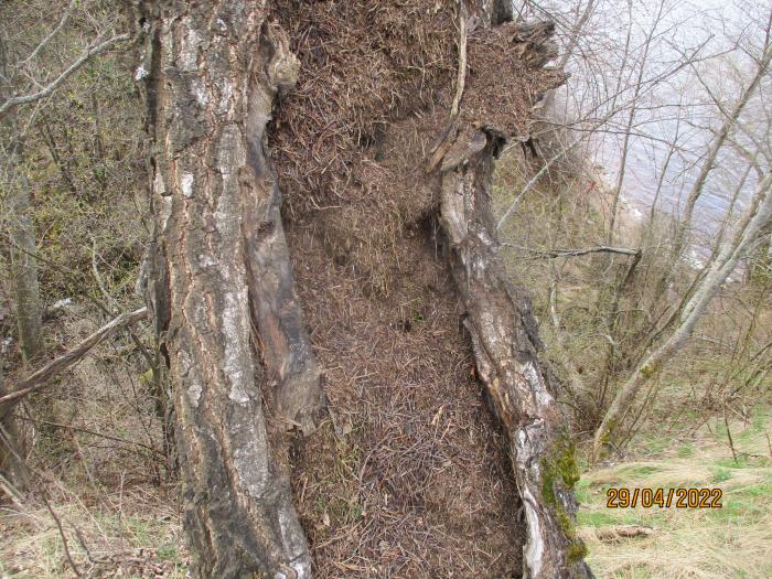 29 апреля 2022 года навестил летнее гнездо поликтены, о котором я писал здесь в мае 2018 года. День был холодный, ночью заморозок до -3. Гнездо пока не живое, не замечено ни одного муравья.