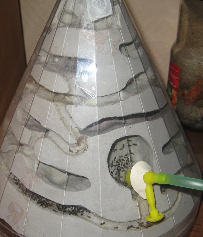 Наконец-то это ужасное переселение позади, еле смог вытурить матку в новый формикариум, пришлось применять реально насильные меры, вплоть до того, что просунул трубочку и дул на муравьев, чтобы перебежали. Меры сработали, а последних 50-60 муравьев просто "выпылесосил", выдув их и вытряхнув на арену нового формикариума.