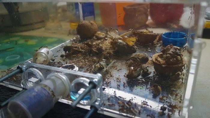 За 1.5 месяца в подаренной семье начали появляться самцы, зафотать их нереально, ибо прячутся в трупах тараков, и такое впечатление что их ценность в семье в разы больше чем ценность бескрылых самок, пытался посчитать сколько в семье бескрылых маток, начитал минимум 50, что как по мне уже может наводить некий страх на людей) Формик меня порадовал, не увлажнял его на протяжении целого месяца(и нет это не автономное увлажнение, это просто 9мм гипса), но тут лучше повторить тесты с другими видами, ибо бики, это бики, их и огнем иногда тяжело ушатать, а тут только засуха. Арена меня тоже порадовала, но уже меньше, с первой ревизии, было еще 6 модернизаций, изучении и до настройки лазерного станка, на котором я раньше работал, и сейчас конструкцию вроде довел до ума...