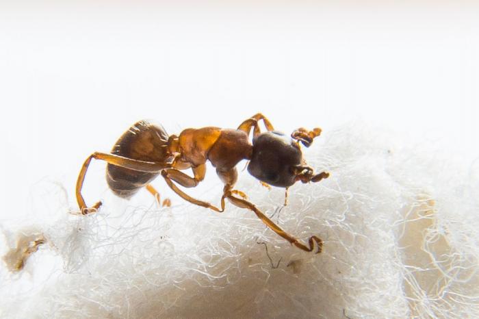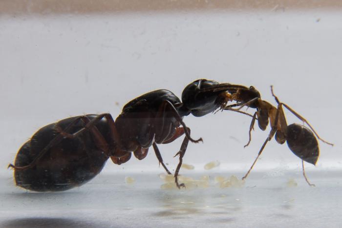 У нас первенец. Я опасался, что матка под шумок ухомячит еще и куколку, но нет, процесс дошел до логического конца. "Фуражирует" сироп пока еще матка, но молодой муравей сходу впрягся в работу по уходу за яйцами. Кстати, лежащая 2 недели муха внезапно активно пошла в ход, за день от нее осталось меньше половины.