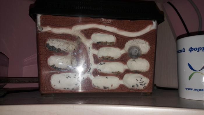 Зроблений з тераріуму Exo-Terra розміром 23х14.5х17 см (дхШхВ). Формікарій має 4 секції ( з кожної сторони) кожна секція може від'єднуватись ватою в разі потреби. На даний момент задіяно тілки 2 секції. Формікарій також має вентиляцію в кожній секції. В формікарій вмонтований термометр і гігрометр для контролю температури і вологості в формікарії