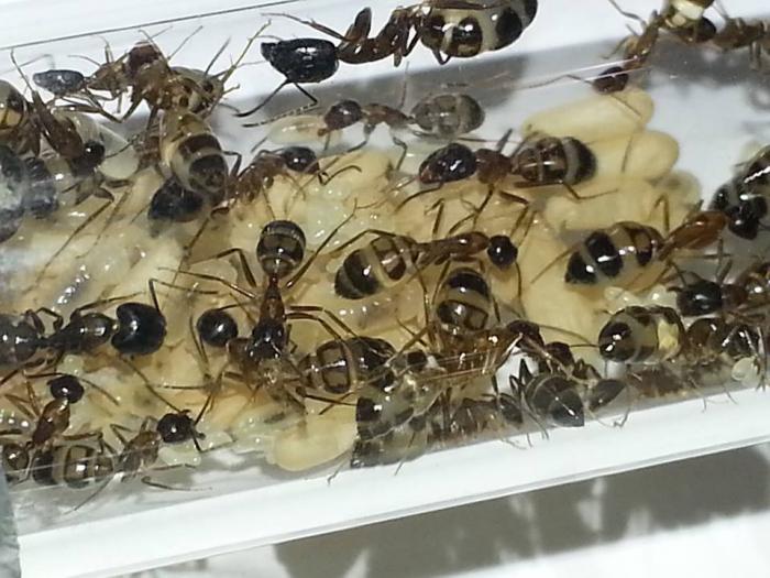 2) 4-5 молодых семей S geminata (2500) - мамашки, расплод, от 10 до ~100 рабочих (мамашки пойманы с разницей в месяц), расплода в несколько раз больше, чем рабочих, "солдат" ещё нет, появляются, когда семья разрастается до 500-1000