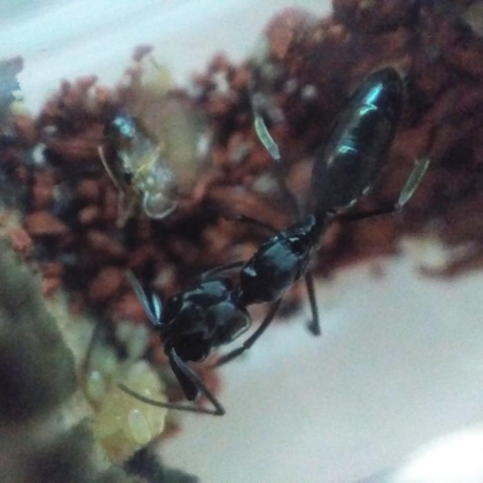 Сегодня среди рабочих муравьев фейдоле от Романа встал на ноги первый солдат. Не думал, что он будет таким крупным.