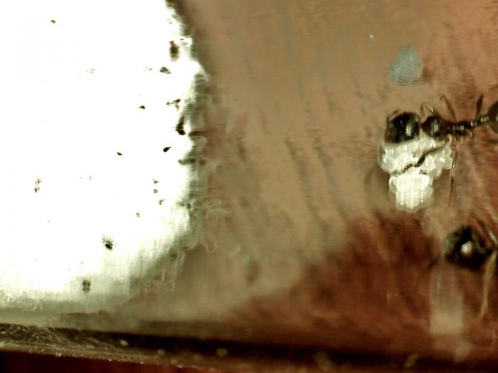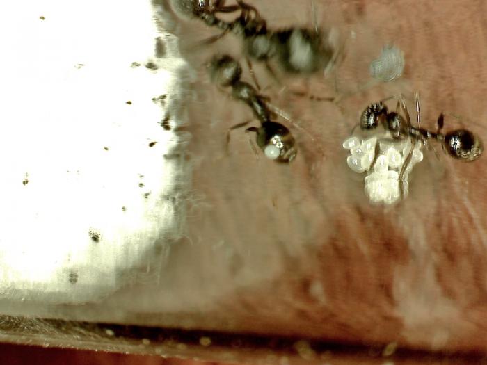 Три месяца назад я забрал у приятеля небольшую колонию структоров с нездоровой и худой самкой. После переезда она отложила маленький пакет, состоящий из 5 яиц. Матка не могла передвигаться, ползала брюшком вперед, передвигая только задними ногами, усики еле двигались. В общем жизнь ее подходила к концу, но она держалась все эти 3 месяца. Рабочие явно чувствовали это и бережно растили прощальные яйца самки. Вскоре почти все яйца превратились в личинок, а потом и в куколки рабочих муравьев. Почти все. Одна личинка все не окукливалась да не окукливалась, увеличиваясь в размерах. Давно я не навещал обреченную колонию, и вот недавно достал муравьев из темного теплого места и увидел трупик многострадальной матки. Также рядом лежало несколько последних куколок и что-то большое и белое. Это оказалась маточная личинка, которая, если ее не съедят, превратится в новую неоплодотворенную самку, способную вылететь и основать новое гнездо, а также продолжить гены мертвой самки. А может и рабочие выведут самцов, и будет шанс на возрождение колонии.