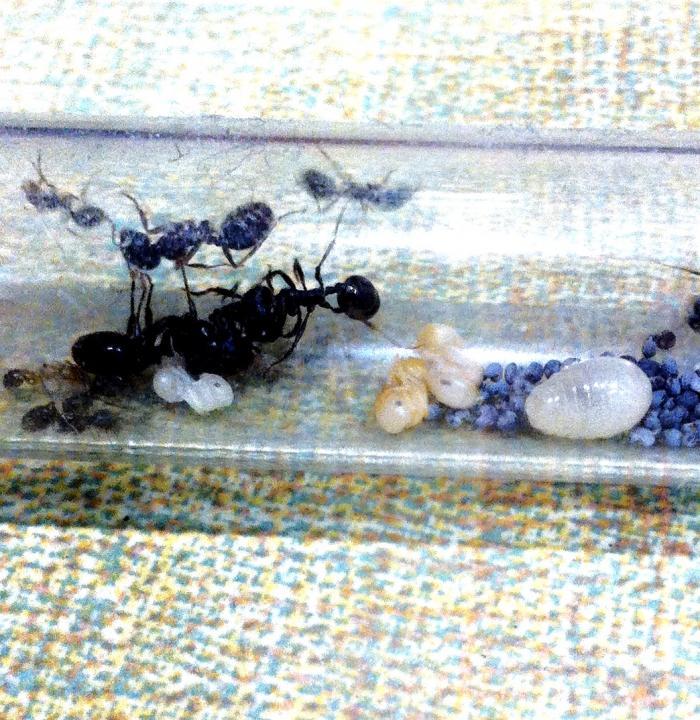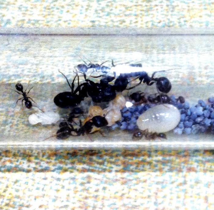 Оплодотворенных самок жнецов в неволе, как мне известно, получать никому пока не удавалось, думаю, это связано с тем, что половые особи взяты из одного гнезда. Хотя в ант планет выращивали самцов из отводков, состоящих из рабочих особей, не знаю получилось ли у них что-нибудь. А моя колония без матки выбрала крупного солдата в новые "дамки", и сейчас у них уже несколько не оплодотворенных яиц.