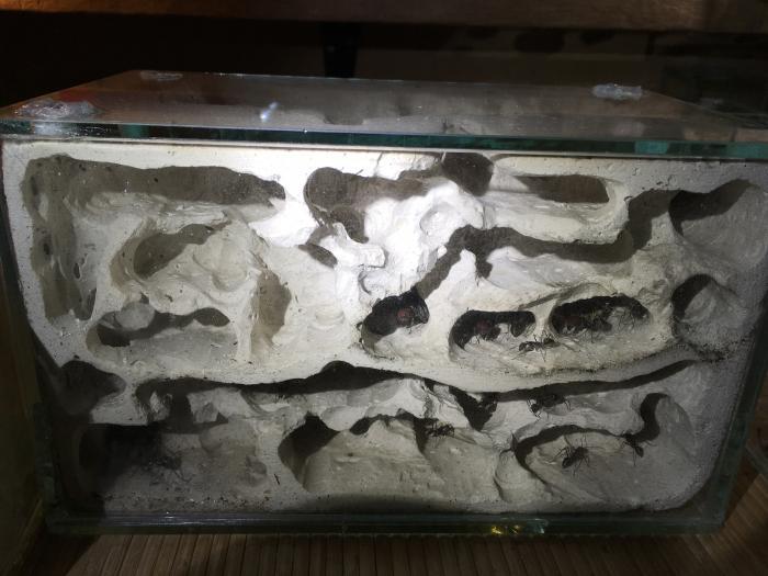 Сингулярисы... ох уж эти Сингулярисы. Это наша шестая попытка. Сначала приехало 200 человек с мёртвой маткой. Потом 100 вообще без матки, Дальше две матки умерли почти на второй день после приезда, продавцы брали денег за Сингулярисов и ничего не присылали, с письмом о продаже Сингулярисов к нам на почту шпионы приходили за контактами нашими, в общем... это Сингулярисный рок какой-то. Наконец мы получили две семьи по сто человек в каждой примерно. Одна поселилась в большом вертикальном формикарии и отлично развивалась около 9 месяцев где-то, бурно росла и размножалась, а затем вдруг вымерла внезапно вся за несколько дней. Вместе с ней погибли от неизвестной "эпидемии"... много колоний. Вторая колония выстояла, но как будто заснула в развитии. Кушают они плохо, мало и неохотно, личинки маленькие худенькие и выглядят голодными, примерно каждый месяц погибает по 2-6 человека, матка ежемесячно несет маленький пакетик яиц, из которых, что то съедается наверняка. Сидят они в огромном для них формикарии, все время кажется, что причина в слишком большом размере помещения, но спросить их об этом трудно. Вылупляется всегда на 1-2 человека меньше чем умирает, в общем в колонии демографический кризис. Мед не даю больше, едят виноград, иногда орешки, туркменов и сверчков. Влажность постоянная 70-80 (но другие Сингулярисы и при 50 жили отлично). Вентиляцию переделали недавно, сделали получше. Подскажите, как справиться с этой бедой. Пересаживать? Я боюсь они ослаблены и от пересадки поумирают только...