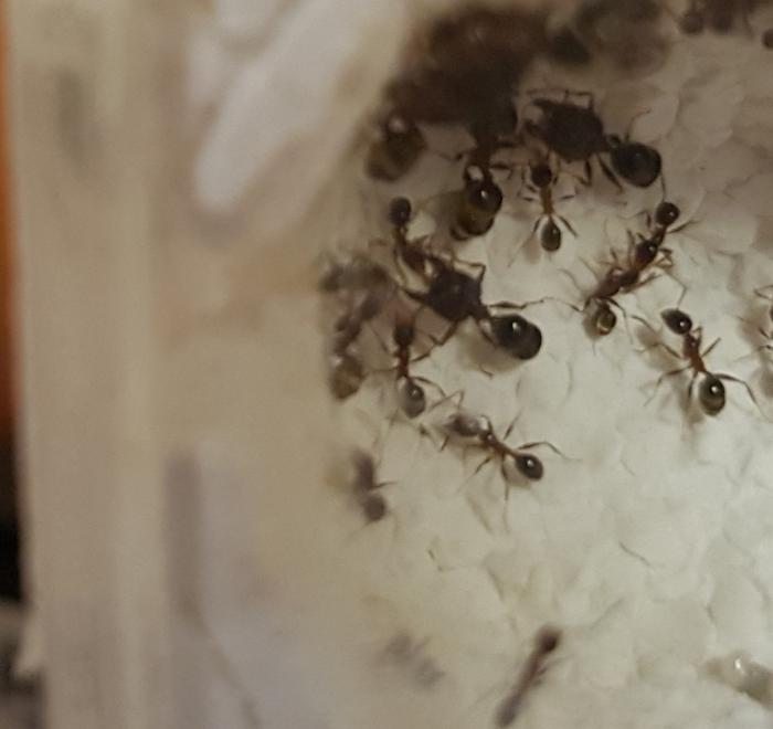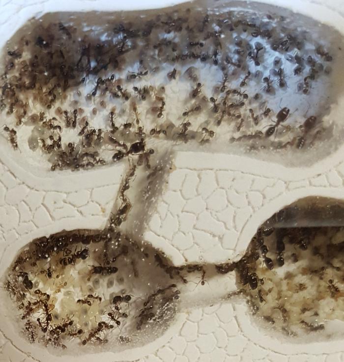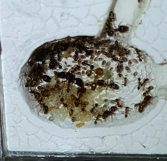 По поводу фейдолей, кормлю их плотно, каждый день пару десятков дрозофил, сироп, через день крупные насекомые ( сверчки,осы,кузнечики). Количество солдат очень сильно увеличивается, но и мелочь тоже не отстаёт, все солдаты ходят как бочки (полные). Так что по поводу недостатка или переизбытка еды, можно поспорить.