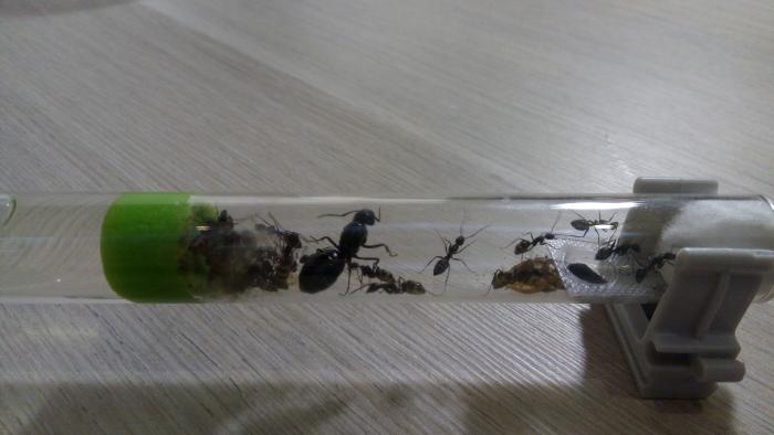 Но в итоге имеем то, что имеем: 26-го июля я всё-таки купил ларгов. На момент покупки состав колонии был такой: матка, 10 рабочих и расплод в составе личинок от мелких до средних, размером с брюшко рабочего, напившегося сиропа. В пробирке, в которой они жили, одна треть жилого пространства была «ограждена» клубком ватного волокна. Для чего он им был нужен, я не совсем понял. Может, рабочие муравьи так обозначали камеру с маткой и расплодом, но меня этот клубок не устраивал, т.к. в нём со стороны расплода и матки был трупик рабочего. Около четырех дней я честно ждал, пока они его уберут, наблюдал за поведением, но особого желания избавиться от потенциального источника болезни я не заметил, поэтому решил убрать весь клубок полностью. Правда, ещё через пару дней я переселил их в новую пробирку, т.к. ватный тампон в старой был сильно загрязнён, так что теперь, я думаю, было нецелесообразно разводить лишнюю суету... Зато теперь на вопросы из серии «Муравьи? Зачем тебе они вообще нужны??» я знаю, что отвечать: «Они меня учат терпению и спокойствию». А на самом деле иногда этих двух качеств мне сильно не хватает в жизни, что уж говорить о киперстве. Но я немного отвлёкся.