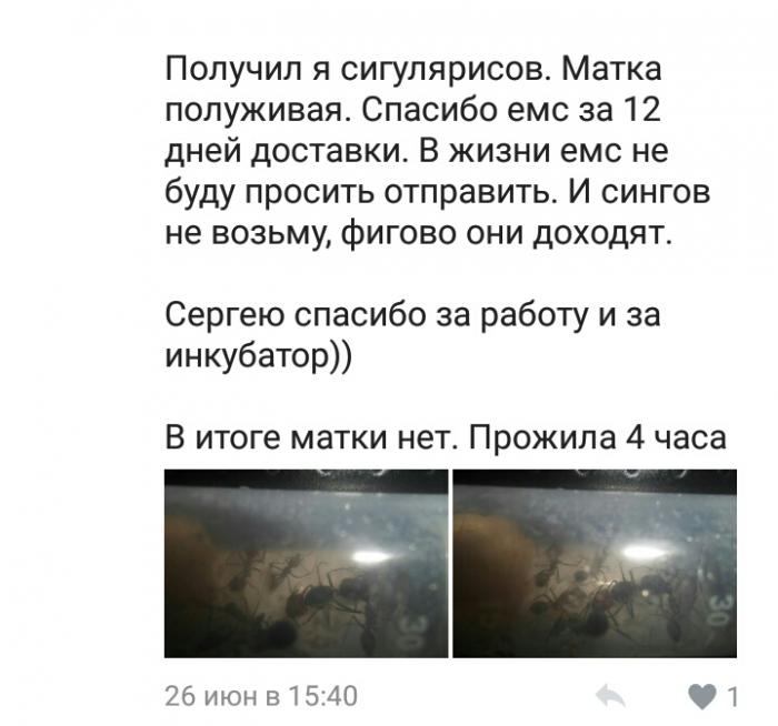 Colobopsis, вы наверно не представляете, сколько маток не доезжает. Так же и жнецы, кампы, лазюки. Вроде местные, всего то 3-4 сотни километров, но приезжают трупы. Это есть у всех мурах. И в любое время года, при любой погоде есть шанс получить трупы.