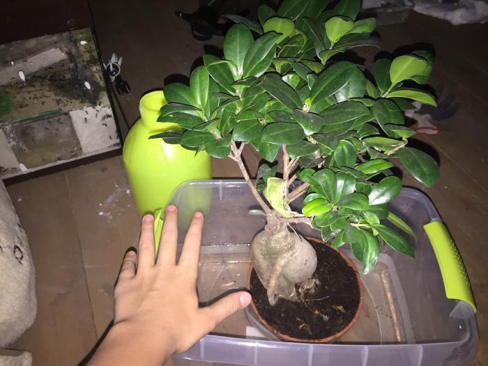 По дороге домой с аэропорта заехал в магазин чтобы купить фикус, выбрал небольшой цветок средних размеров с самой пышной кроной и продолжил путь домой. А там не помыв руки бросился заселять эков на фикус, положил кокон с колонией сверху на листья так чтобы было удобно наблюдать. А уже на следующий день я наблюдал за оперативным склеиванием листьев портными, зрелище конечно захватывает, я такого никогда не видел (залип где-то на час). Саму матку с расплодом я увидел только когда срезал их гнездо с дерева, больше я её не беспокоил. В гнезде находилось много расплода на разных стадиях развития и около 30-40 рабочих так что я был уверен что если выживет матка и большая часть расплода, колония достаточно быстро восстановиться. Сначала фикус с гнездом был помещён в тазик наполненный водой (остров) но с такой конструкцией было сложно поддерживать нужную температуру и влажность, по этому в чёрную пятницу дул куплен большой террариум (ExoTerra) и им уже было удобно манипулировать. На дно террариума был размещён термо-шнур поверх которого я насыпал грунт (земля для домашних растений в перемешку с кокосовым субстратом). В террариуме очень хорошая вентиляция, но если побрызгать грунт, то из-за температуры шнура влага очень быстро испаряется и мелкая сетка не успевает пропускать испарения быстро и появляется конденсат и создаётся высокая влажность (я так делаю на ноч) имитируя природные условия. Сейчас в колонии около 50 рабочих. В обшем это самы интересный вид муравьев из всех что мне доводилось видеть.