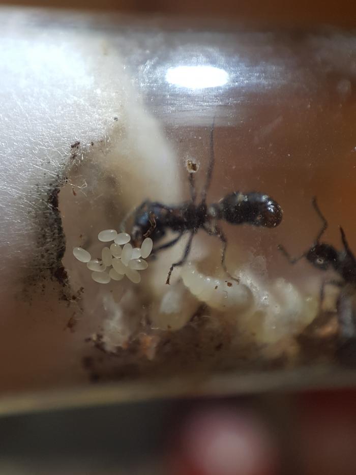 Матка прибыла даже с расплодом. Одно маленькое яичко, бережно удерживалось в мандибулах.