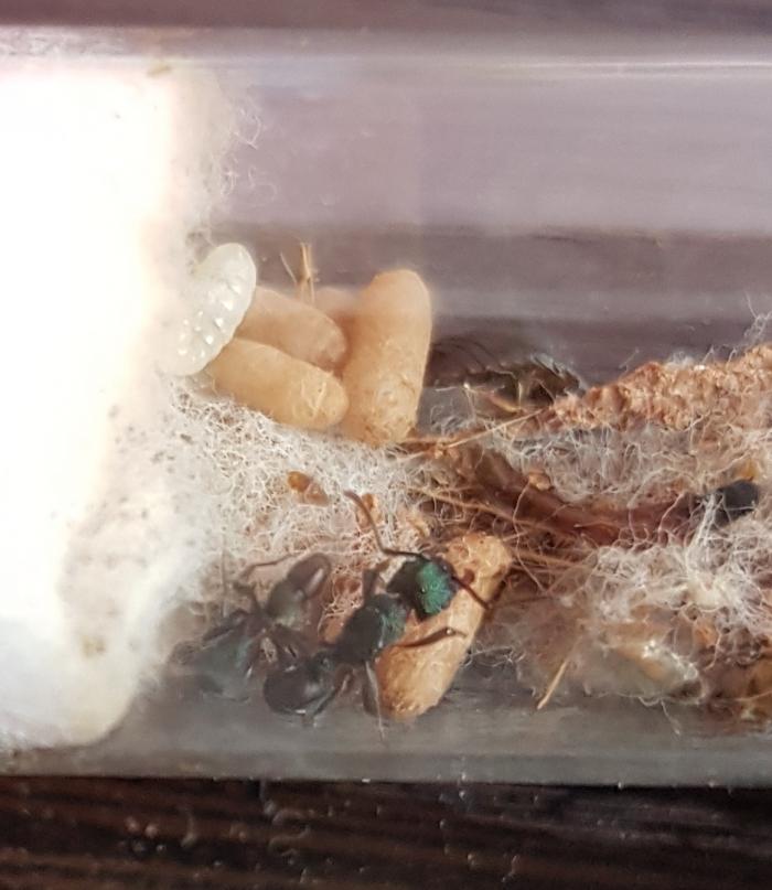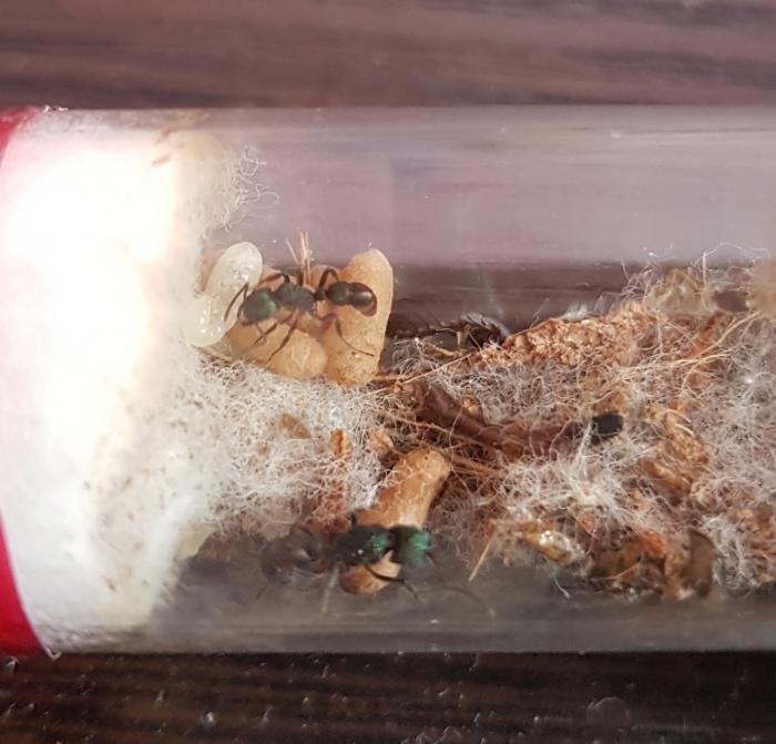 Всем привет. Решил показать, на сколько отличается первое поколение от второго. Кокон в разы больше. По наблюдениям: матка активнее рабочего. На данном этапе развития, она главный добытчик в семье. Рабочий хоть и не очень проворен, но постоянно ухаживает за расплодом. Так как семья живет в инкубаторе, наблюдаю интересное вплетание волокон ваты в коко-грунт и разделение гнезда на отсеки. Описать это сложно. Но яйца хранятся практически во влажной вате, личинки помельче на коко-грунте. А свежие коконы и крупные личинки находятся в грунте, можно сказать закопаные. Кокон, которому пару недель, лежит отдельно. И постоянно переносится, то ближе к вате, то дальше от неё
