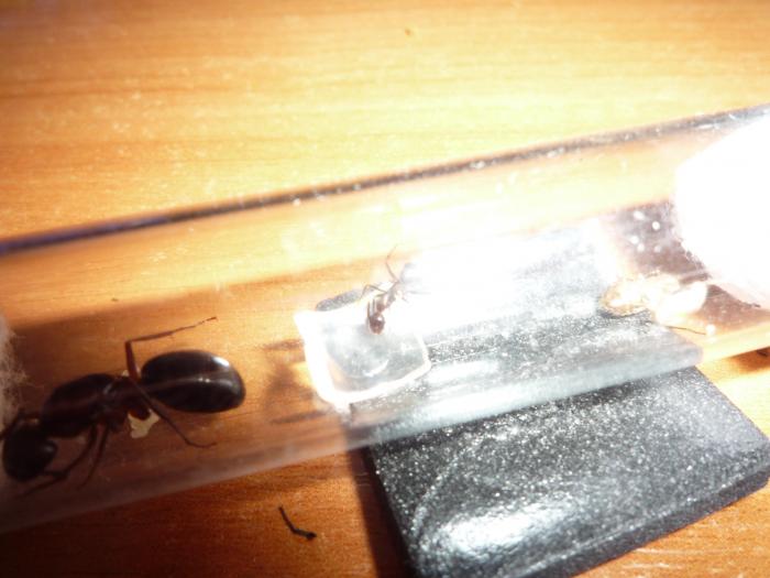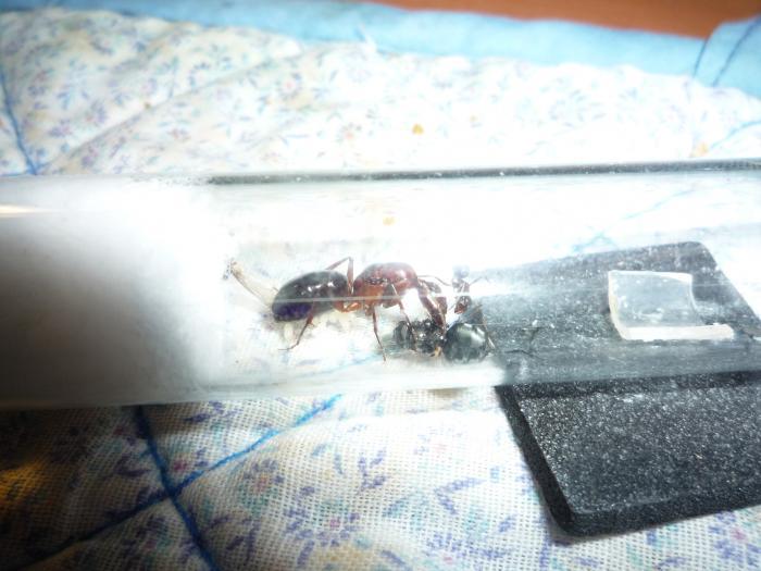 Доброго времени суток, решил я всё-таки написать бложек о этих красивых (для меня) кампонотусах.Приехали они ко мне уже вот-вот как 5 дней назад.На недельку я их откладывал в темноту, дабы уменьшить стресс после пересылки, ну или совсем его исключить :) По началу, эти мураши отказывались от любой еды, которую им предлагали (скорее всего, тогда ещё сказывался стресс).Но сейчас, вроде, начали есть мух, даже таракана скушали :).Что настораживает, так это то, что они совсем не пьют любой из видов сиропов (медовый (гречичный, цветочный), сахарный (1 к 4)) .Так же давал им яблоко (выращенное) , тоже не едят.Матка снесла уже 8-9 яиц, которые она аккуратно всегда складывает около влажной ватки.Сейчас пытаюсь поймать дрозофилок, может они будут лакомиться этой мошкарой.Буду ждать первых личинок, коконов , а затем и рабочих(З.Ы. один рабочий я не знаю как оказался с маткой, вроде у матки расплода никогда не было, может подсаженный)