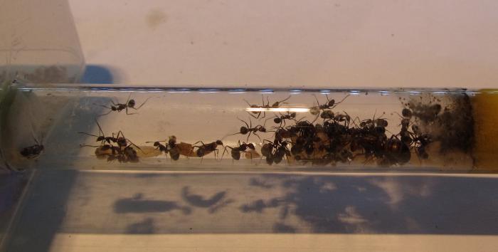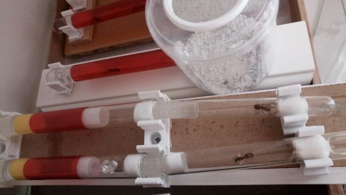 Зато дрозофилы пролезли в пробирку к никобаренсисам (матка и 5 рабочих). Ловили все, в том числе матка. Но есть не стала сама, видимо это не царское дело, когда уже есть кому переработать.