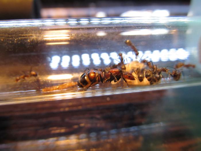 Например, матка мессор структор, купленная совершенно не в сезон 31 октября (за восьмикратную цену, уж больно приспичило) и имевшая на тот момент всего трех рабочих, что совершенно ненормально, если учесть, что с момента лёта прошло 7-8 месяцев - вроде за полгода выправилась, рабочих уже около 40 шт., и есть и яйца, и личинки, и куколки.