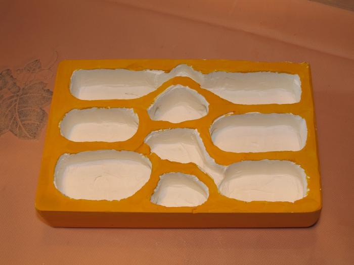 Пришлось в срочном порядке отлить плиту из гипса, быстренько вырезать в ней камеры (извините за качество, резал второпях), на скорую руку покрасить и установить, как и планировал, снаружи левой стенки формика. Проход в стенке существовал изначально, просто был заткнут пробкой.