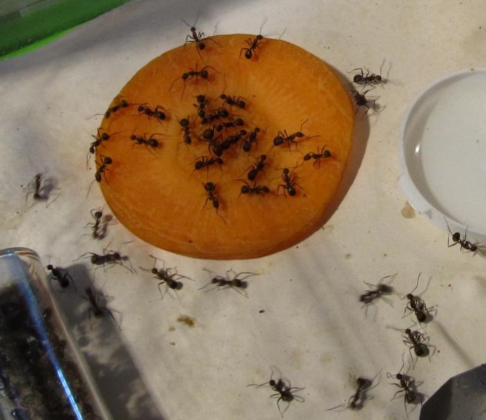 Попробовал дать кампонотусам никобаренсисам кусочек свежей моркови. Оказалось, она им очень нравится. Высасывают из нее сок, пока не превратят в "сухофрукт"!