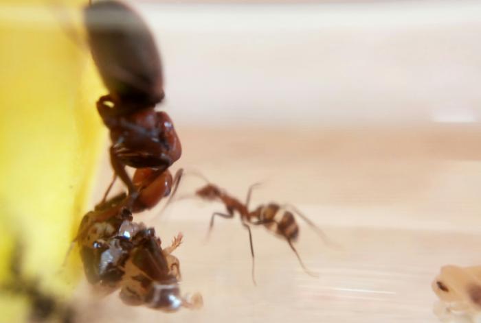 Они почти сразу его обнаружили, быстро затащили в гнездо. Нифига не боятся, хотя их всего 1/6 сейчас. Тут же ко входу подошла матка и... Смотрите что было :)