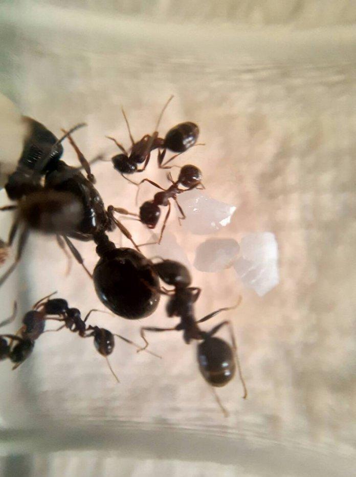 Осенью заказал мессор у одного известного магазина. Посмотрел - живые, забрал. Увидел, когда пришёл домой, что матка засыпана семенами и возможно всю дорогу так и ехала(сутки). Но она живая и вроде не травмирована. Приехала с тремя яйцами, из которых вылупились рабочие. Приехала где-то с 17-20 рабочими. Заказывал сразу к ним формикарий Кристал, туда и подключил пробирку.