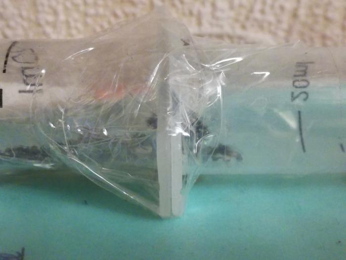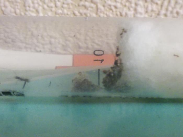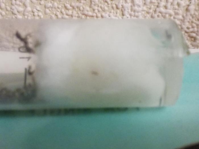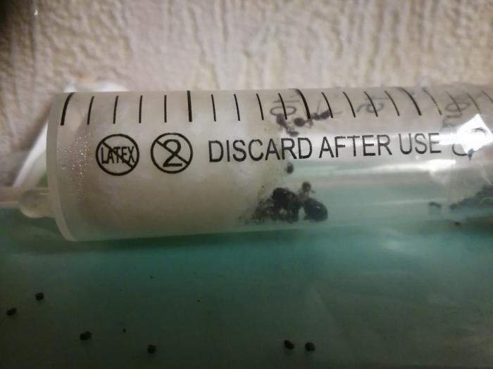Купив жнецов я оставил их спокойно развиваться пару недель, ибо продавец снабдил их кормом. Потом я заметил что вода там осталась только в виде налёта на стенках шприца. Не долго думая я сделал новый шприц и присоединил его к старому с помощью скотча, предварительно сделав вентиляцию в виде 6 дырок от иголки. Муравьи не захотели переселятся поэтому у меня появился вопрос: