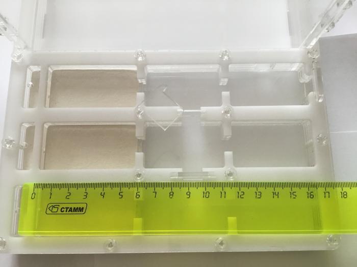 Немного истории создания и «почему прототип 2». У меня не было опыта разработки формикариев и опыта работы в графических редакторах, моя работа не связана с графикой. Пришлось мне не просто :). Проектирование формикария зависело от навыков работы в CorelDraw. Первая версия формикария была на 6 мм тоньше, соответственно высота сухих камер составляла лишь 9мм, а высота камер с гипсом — 6мм.