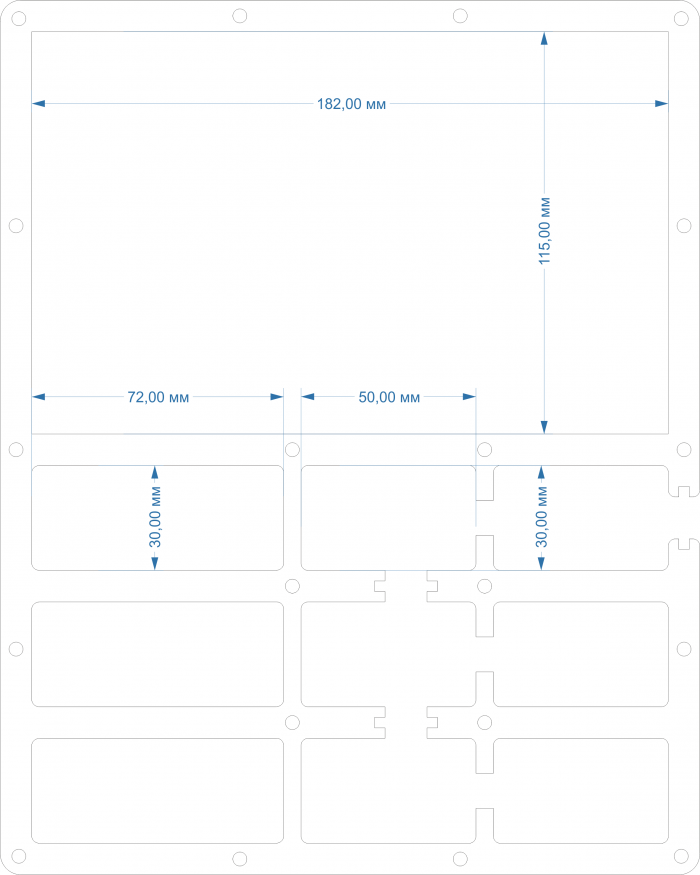 Весь формикарий изготавливается из акрила толщиной 3мм. Ширина формикария 20 см, длина 25 см и полная высота 9.6 см. Формикарий собирается из 7-ми листов акрила, я рекомендую 2-ой и 6-ой листы вырезать из "молочного" акрила, тоже толщиной 3 мм.