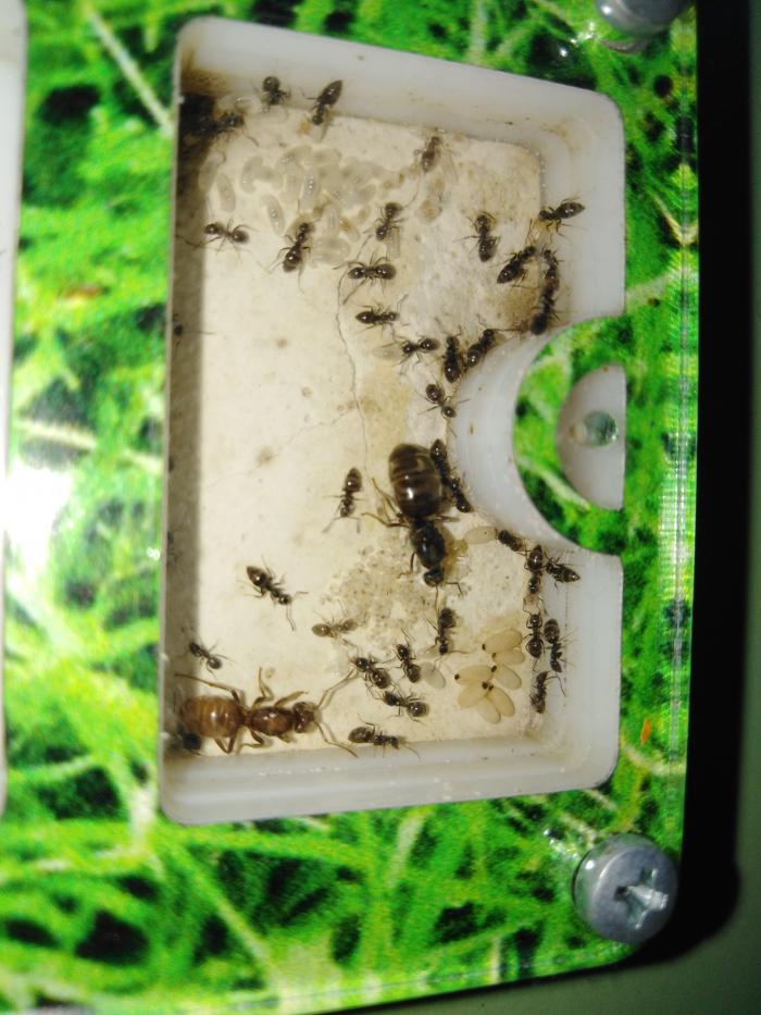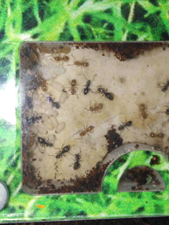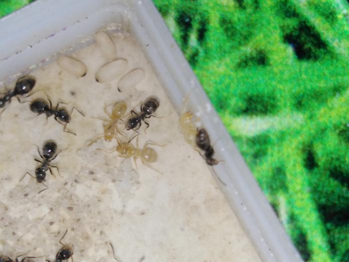 Интересное наблюдение. У мои вагусов всё вперемешку, а у нигеров тоже какое-то подобие сортировки: в одной камере мелкий расплод, а в углу яйца, в другой по краям личинки, а в центре коконы. Разные виды расплода не перемешивают.