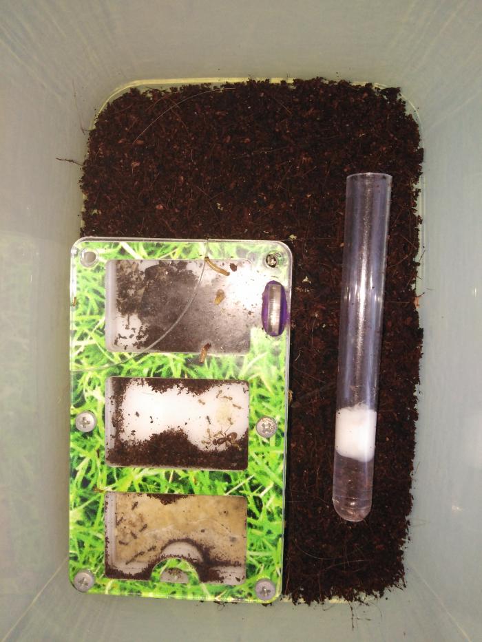 Копая червей для своего тритона в куче компоста, я увидел что-то рыжее. Это что-то оказалось маткой умбратуса. Королева просидела с червями до подготовки инкубатора, в который была заселена. Позже я взял одного мелкого рабочего нигера и через заморозку подселил к матке. На следующий день еще одного. Потом подбросил коконы и покормил сиропом. Осталось только ждать.