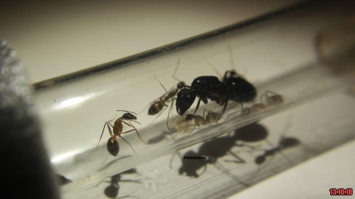 Сегодня, семью пришлось переселять - пробирка была грязной и неудобной.(видел, как муравьи скользили) Прошло всё гладко и без происшествий, - муравьи и весь расплод не пострадали. В награду за переселение им был предложен небольшой кусочек туркменского таракана, гемолимфу которого они сейчас пьют.
