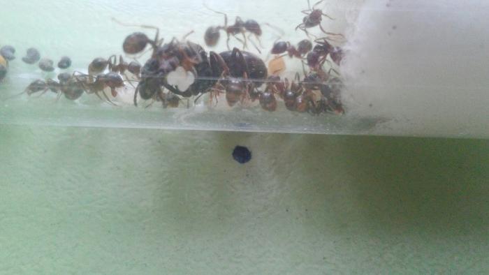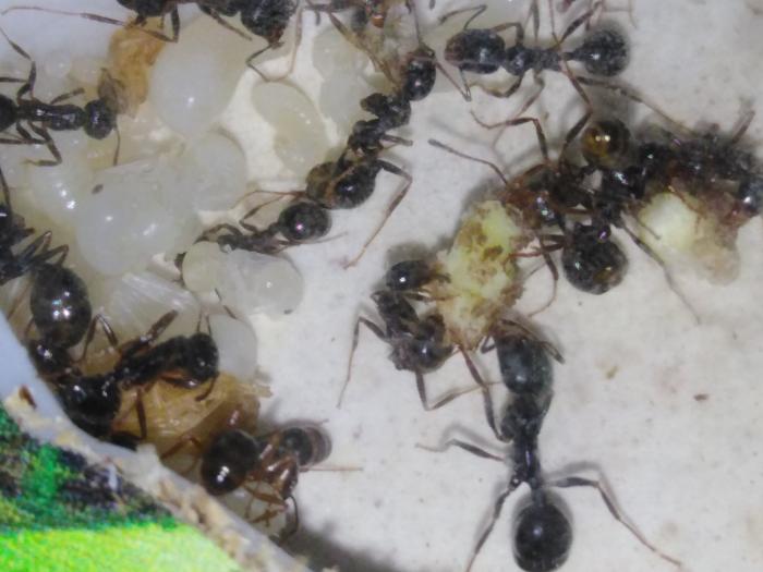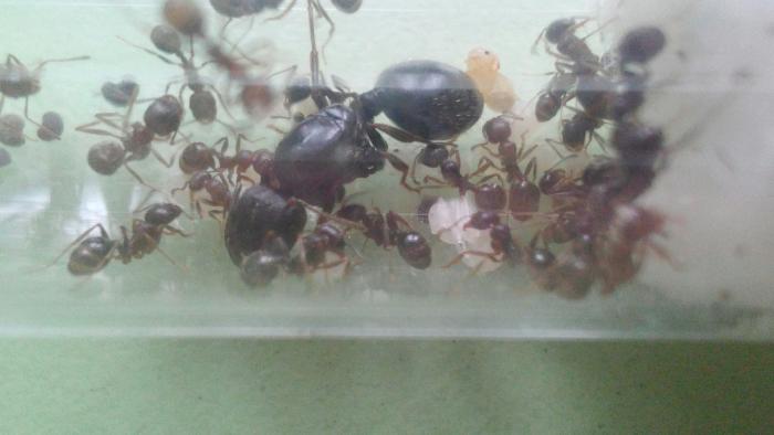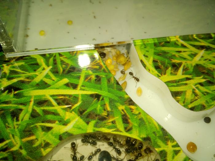 Так же вчера застал матку за кладкой. В течение двух минут появилось три яйца. Первое самка подобрала сильно согнувшись, два других тут же забрали рабочие.