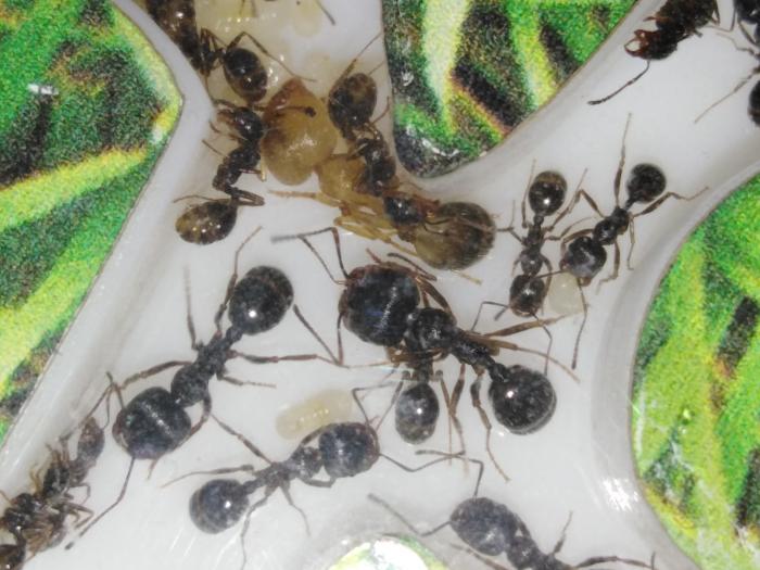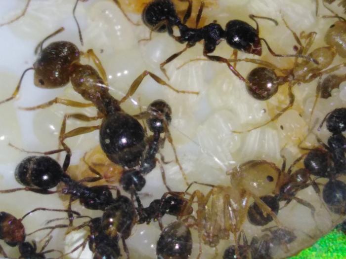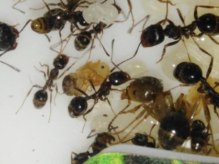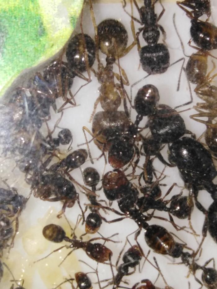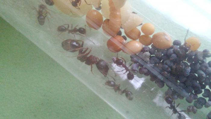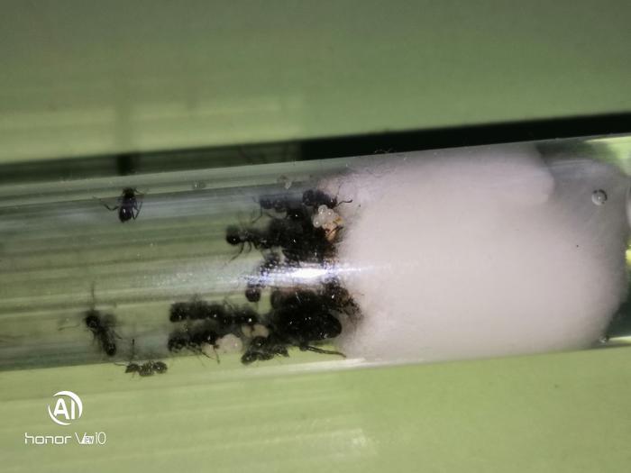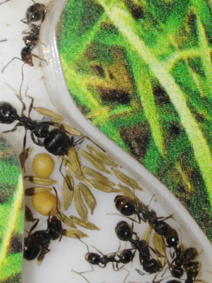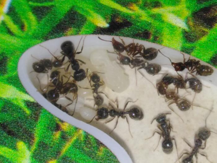 Сейчас в колонии насчитывается чуть более 40 рабочих, есть пакетик яиц, несколько личинок и куколок.