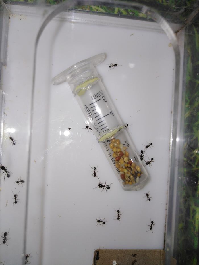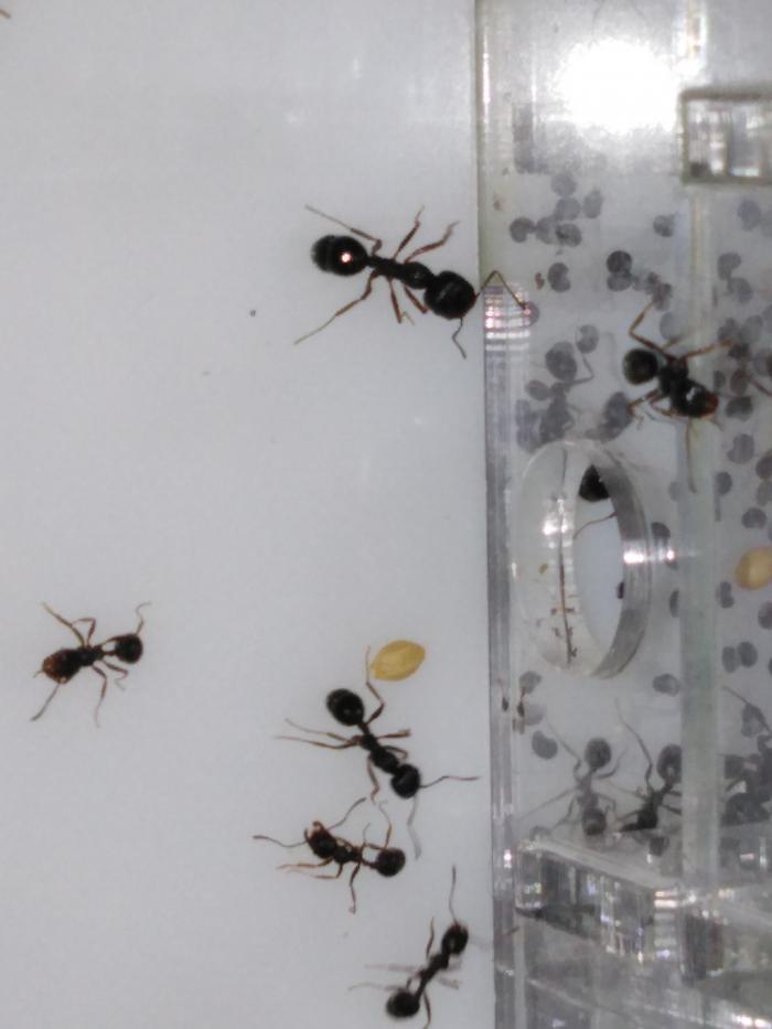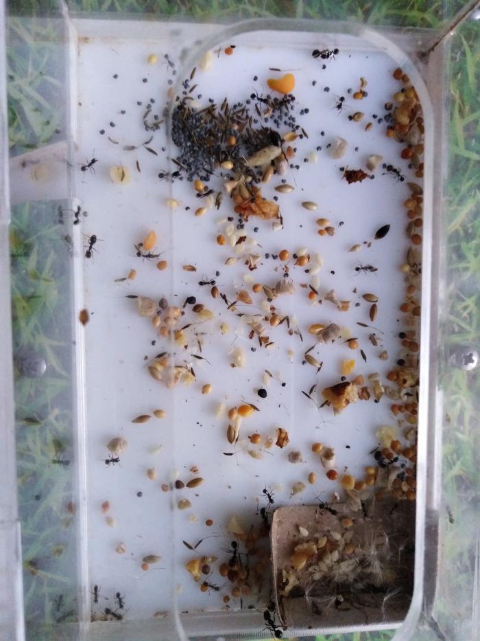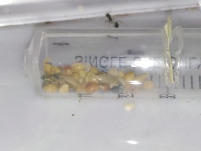 Мессоры заехали в новый формикарий, развивались они в пробирке медленно. Сейчас их около 50. Кстати, в формикарии я наконец заметил процесс размачивания и шелушения семян.