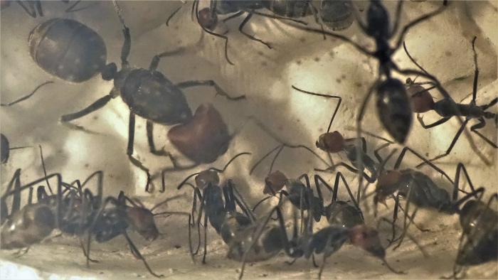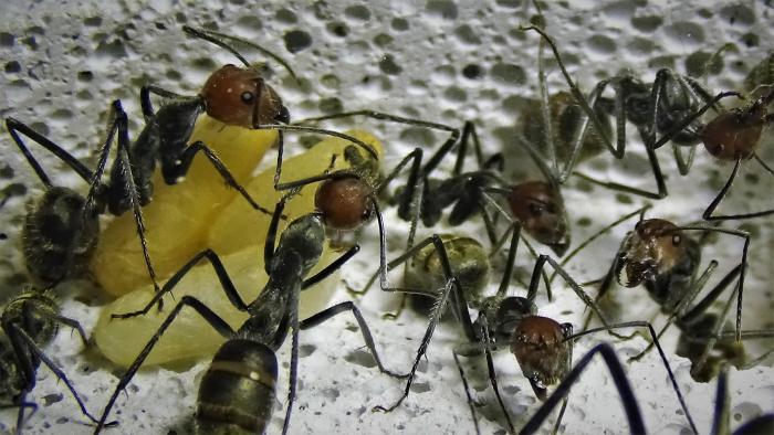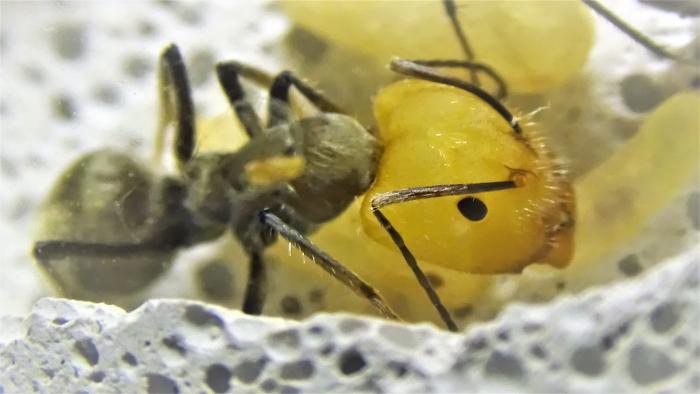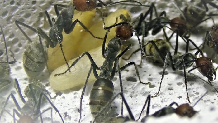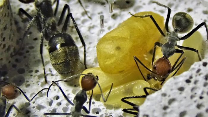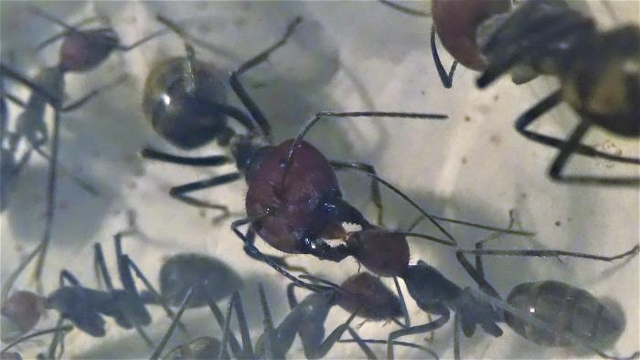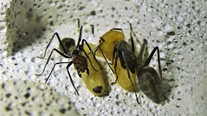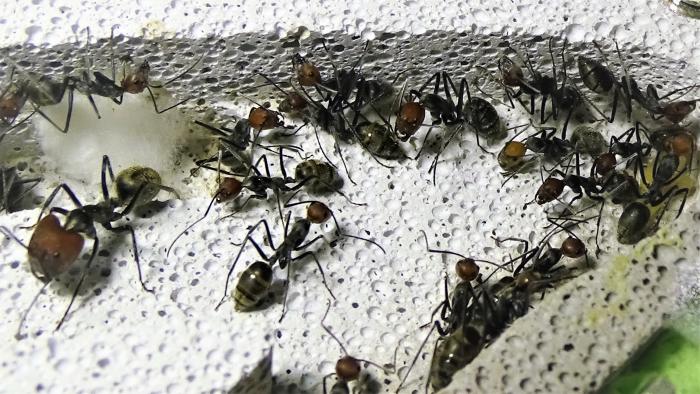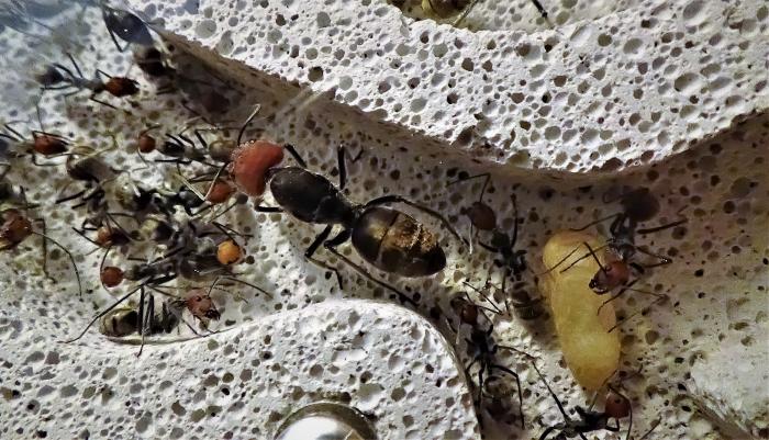 На данный момент в колонии ~100 взрослых особей, но это в основном благодаря старой матке, от новой королевы не более 10 новых рабочих, несколько коконов, чуть-чуть личинок и пакет яиц, у них была не долгая диапауза с месяц наверное, но вот сейчас смотрю, разгоняются.