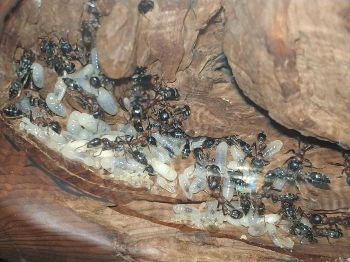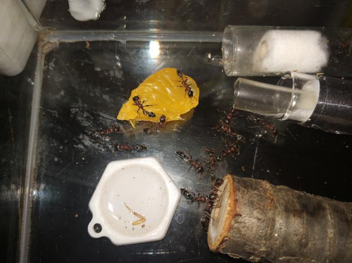 В общем пришлось насильно ,но аккуратно вытряхивать из деревяшки. Убрал всё кроме пробирок и деревянного формика.кушают турка и бананового таракана. Так же кинул грушу и выдавил сок мандарина.