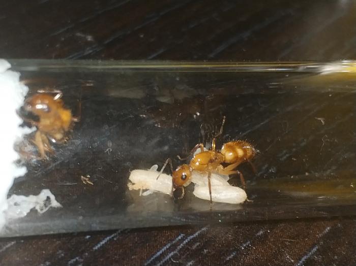Потом я этих маток встретил, они даже трофолоаксировали. Но как только оказались в общей пробирке, одна начала другую под себя подминать, подрались. Еле я их разделил.