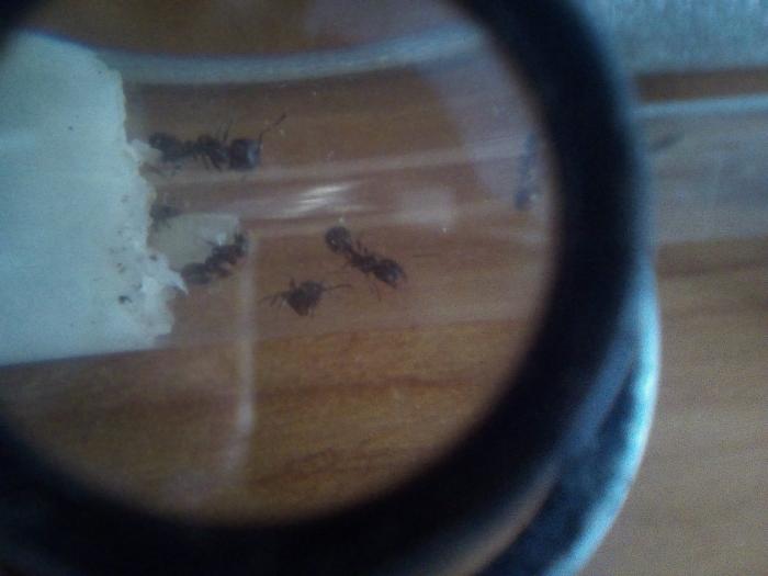 Колония отправилась после инцидента с антипобегом из тальк, теперь их 56-60. Кормлю вареным мясом курицы, яичным желтком (белок им не по душе), мухами, предварительно обдаиыми кипятком. Начинаю замечать, что одной мухи им уже мало, дал две, но результат увидел лиш вечером т.к. после кормежки ушёл на работу. Квечеру от мух остались лишь мелкие частички на куске мусора в углу арены.