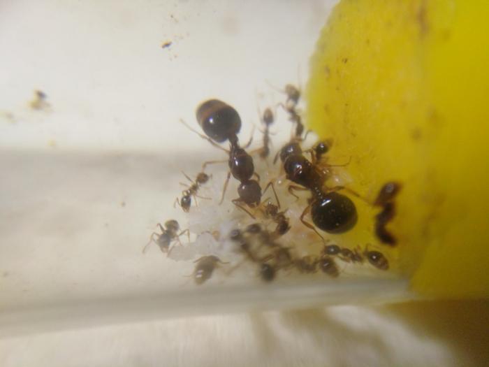 Купил я их в конце октября в составе 2/0. Да, на сколько я знаю, афеногастеры- моногинные мурашики, но об этом также скажу позднее. Расплода было без преувеличения гора. Было около 20 личинок и раза в два больше яиц. Самая главная их черта, которая меня и побудила на их покупку, это самостоятельное питание личинок. По этой причине старался давать суринамских тариков, или же мучника, игнорируя знахаря (логика в том, чтобы КО был крупнее, и матки самостоятельно разделывали добычу, чтобы последствии выложить на него личинок). Корм в основном состоял из белка, т.к. матки углеводы игнорировали. Схема кормежки была такой: раз в два дня белок/два раза в неделю глюкоза. Кстати, это были мои единственные мураши, которые любили глюкозу. Сироп они тоже пили, но глюкоза была для них намного предпочтительнее) Втечение недели у них появилось около 5/7 куколок. Далее, примерно через 10 дней после покупки у них появился первый рабочий. Через пару дней ещё один. После пятого рабочего, они появлялись каждый день, иногда по две особи в день. Кстати, к тому времени они уже как неделю должны были впасть в диапаузу, но до конца декабря они успешно игнорировали данную потребность. Они практически полностью отказывались от углеводов, зато белок они ели постоянно. К концу декабря их численность перевалила за сорок рабочих особей, но конфликтов между матками я не наблюдал. К сажалению, ввиду моего переезда, мне пришлось продать данную семейку. Если бы покупатель выходил на связь, то я бы смог вам рассказать, как уживались две матки, но он меня успешно игнорирует, поэтому такой полигинный пример у афеногастеров назвать показательным нельзя, ибо скорее всего сказалась достаточно малая численностьсемьи, что удерживало маток от конфронтаций.