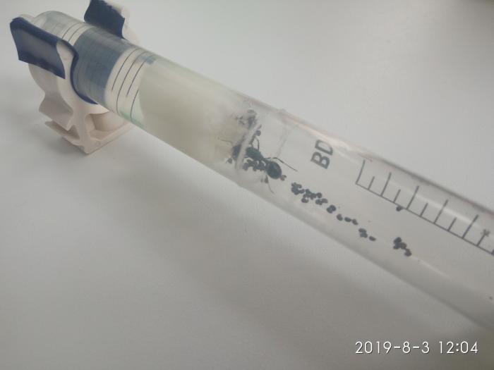 Итак, спустя 2,5 недели, мое терпение лопнуло, и я решил проверить состояние матки. Опять кормовая личинка.... Что это, я не знаю, не кормил после последнего поста, мак был... Могла падать температура, так как я иногда перед сном проветриваю комнату. Но этот перепад очень незначителен. Я собираюсь взять у одного хорошего человека матку мессоров с 10 рабочими,т.к хочу жнецов к новому году, а зимой доставка почтой-это лотерея