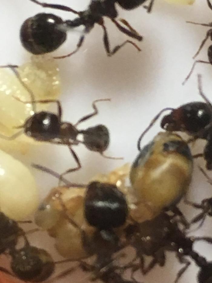 Спустя где-то месяц муравьи успешно росли в количестве пополняя ряды бойцов, одно яйцо уже было неприемлемых размеров что заставило меня задуматься о надежде на новую матку. Спустя неделю моей радости не было предела из яйца уже проглядывались черты матки. а еще вылупился первый самец (тогда я думал что колония обрела шанс на новую жизнь). Время шло, матка чернела, самцы вылуплялись, я тока радовался и подкармливал их, и вот долгожданный момент настал - она зашевелила усиками и легла на спину. Как же я был рад, муравьи активно суетились возле нее и скорее всего тоже радовались. На следующий день ситуация не изменилась только я заметил что у матки какие странные ноги - обвисшие и бесформенные (совершено не нормальной формы) - я скинул это на недоразвитие (все-таки матка не маленького размера и ей нужно побольше времени думал я).