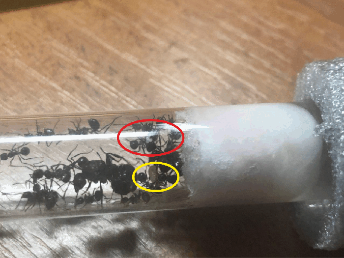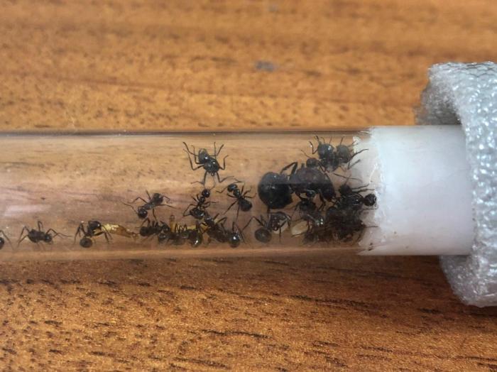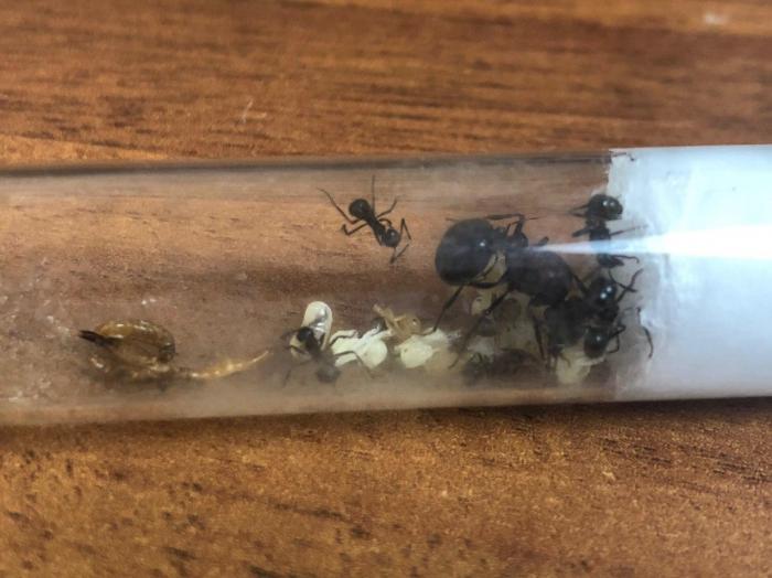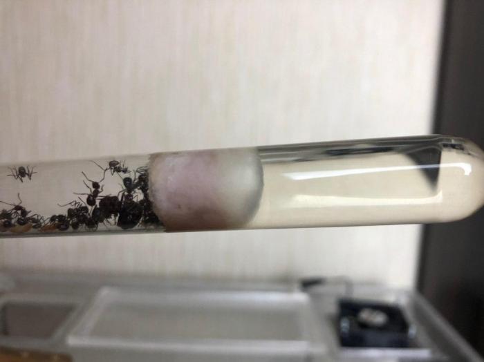 Для справки: у меня есть еще одна колония мирмикарии, прибыла в составе матка, один рабочий и расплод, колония питается также как и первая, и активно развивается. Уже 5 новых рабочих и куча расплода. По прибытию так же была пересажена в новую пробирку.