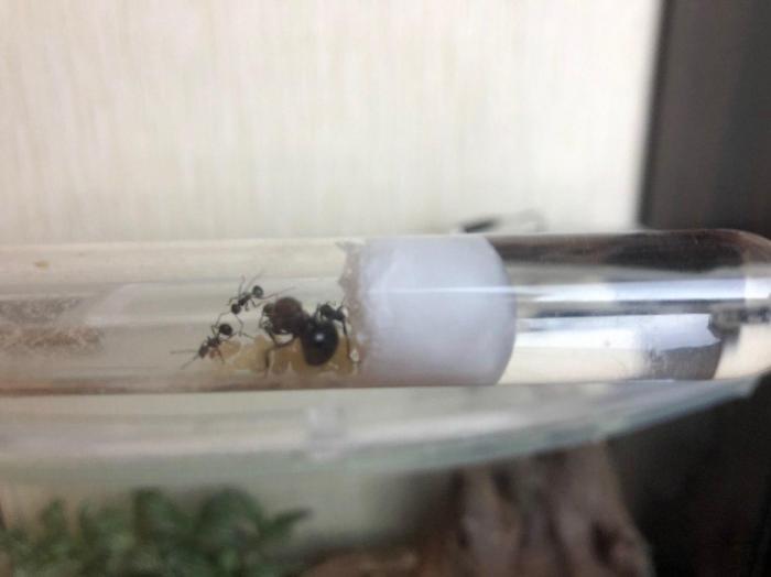 Первое фото, колония которая замерзла, кто не вкурсе смотрите выше ее историю. Так вот, когда она приехала и отогрелась, в пробирке начала краснеть вата. После переселения таже ситуация. Из расплода 3 яйца(недавно появились) и 1 личинка. Практически игнорируют белок, медовый сироп пьют.