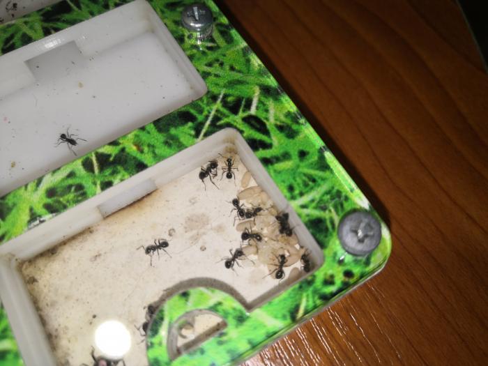 После того как формикарий был перенесён в тёплую комнату жизнь муравьёв наладилась. Напились сахарного сиропа и охотно берут мелких тараканчиков быстро и слажено мобилизуясь для доставки их в формикарий. Отзимовавшие личинки пошли в рост, охотно этих тараканчиков поедая. Но самое главное - самка сделала небольшую кладку :)