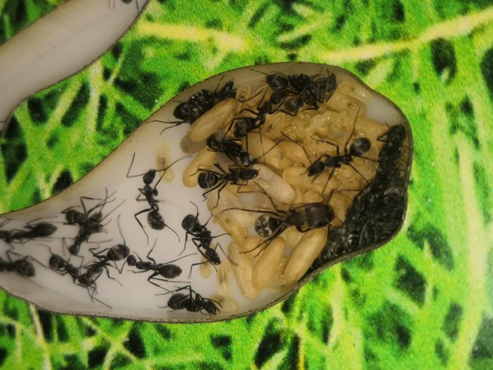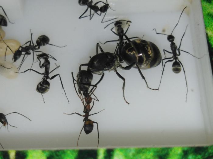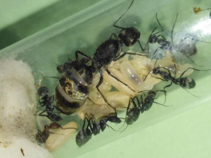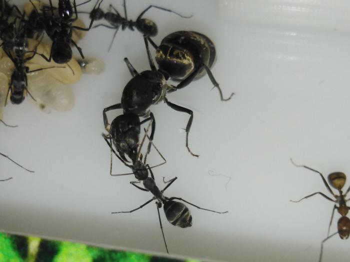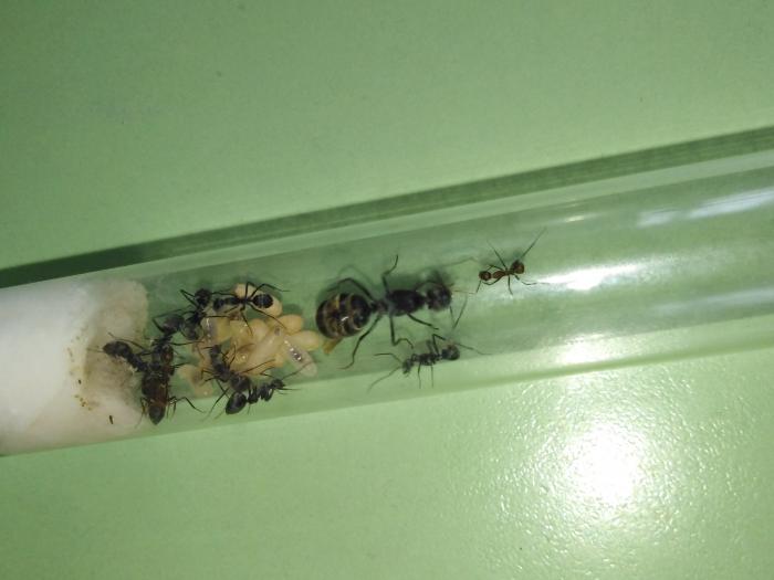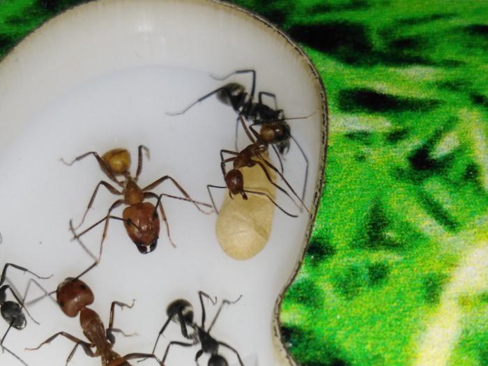 Сегодня в семье ауриевентрисов появился первый солдат. И даже не один, а целых три! Правда, не ауриевентрисов) Я закинул трех солдат из семьи ников, и они приняли их почти сразу, заставив произвести трофоллаксис. Видимо, запахи схожи.