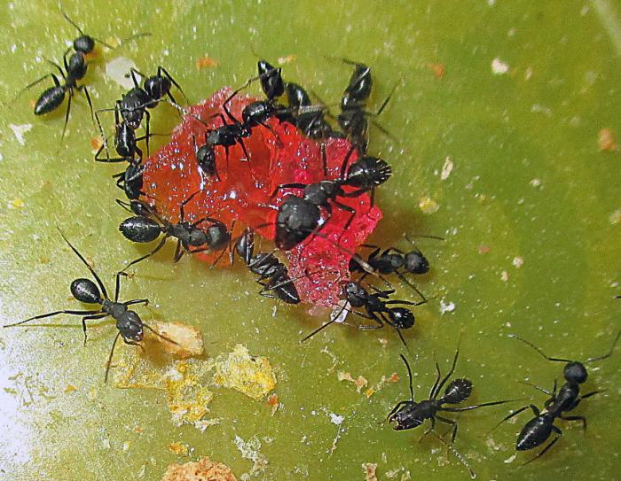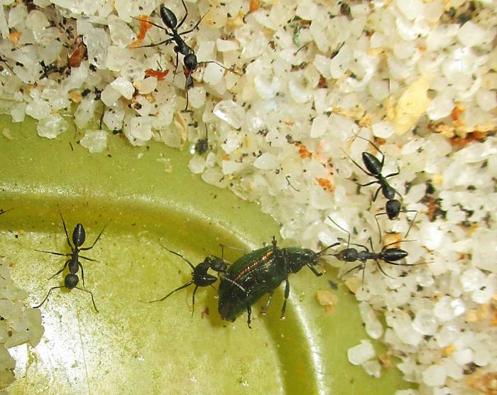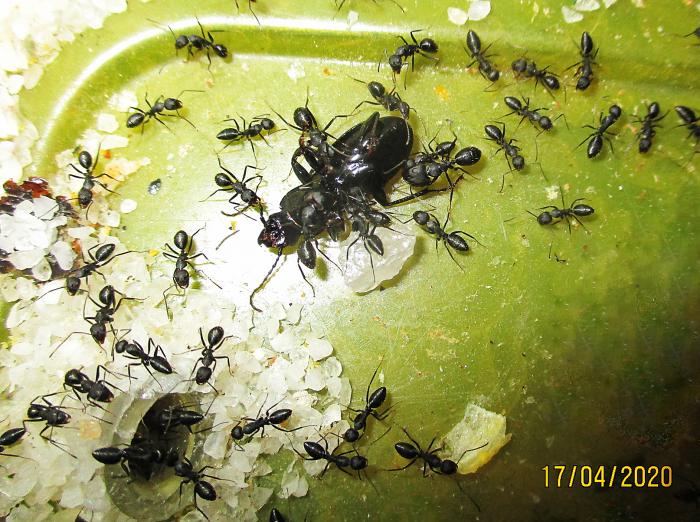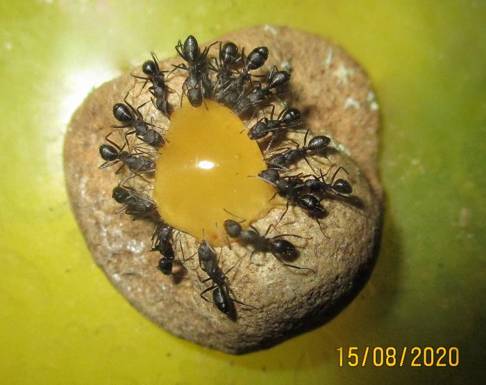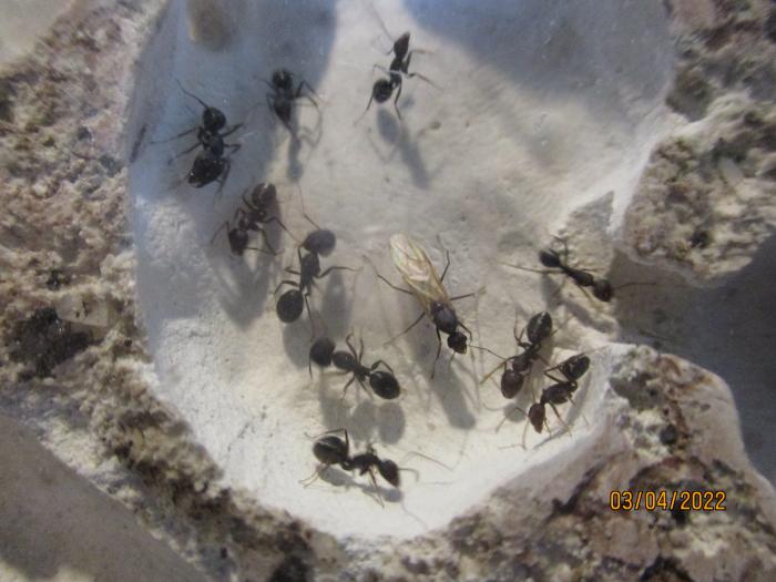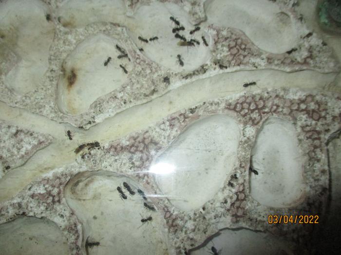 Муравьи оказались непривередливые в еде и поэтому проблем в кормлении не было. Поедали сверчков, тараканов,мух, мучного червя, фрукты,мед. На таком рационе семья быстро пошла в рост и вскоре пришлось думать о переселении в формикарий. Решил предоставить им ранее изготовленный гипсовый формикарий, часть камер в нем ззасыпал крупным кварцевым песком. Большая пробирка-инкубатор не помещалась на арене, пришлось переселять варварским способом. Просто вытряхнул муравьев с расплодом. Муравьи быстро осмотрели новое жилище и стали быстро перетаскивать в него куколки и личинки. Матка до последнего не хотела уходить, рабочему пришлось ее уговорить и дать направление.