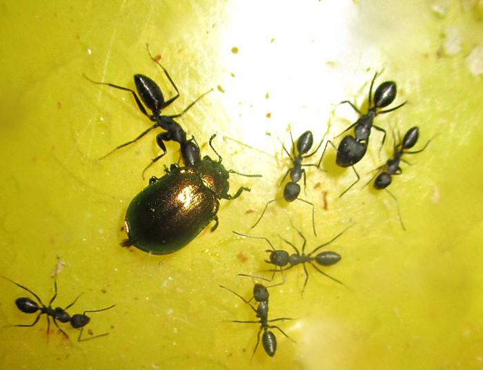 Золотой жук Linaeidea aenea, листоед ольховый, попав на арену, пытается убежать. Кампонотусы долго гонялись за ним, пока не поймали за усики и лапки и остановили. Подоспевший солдат нашел в броне сочленение.