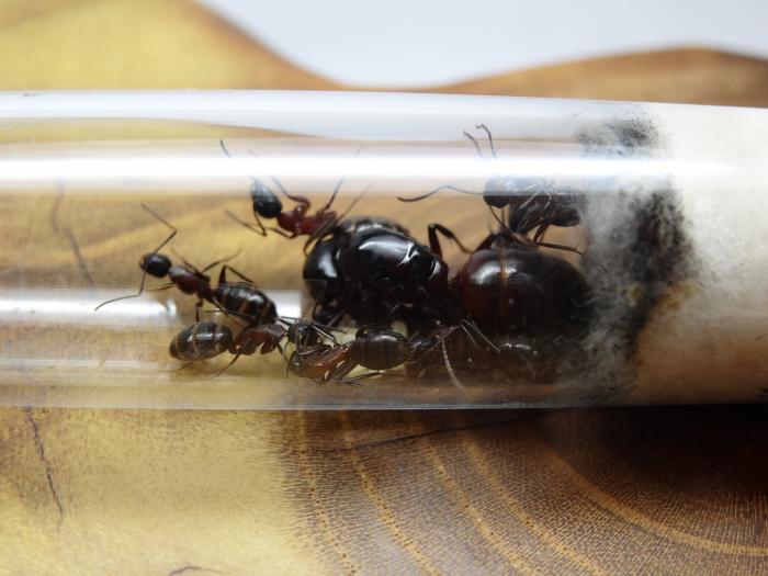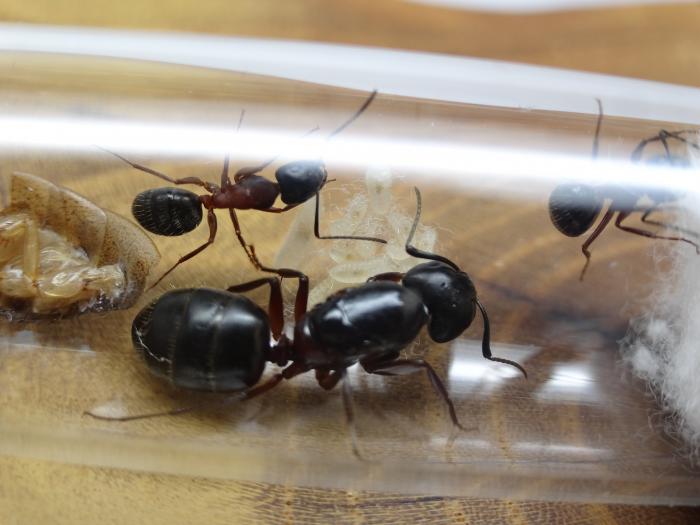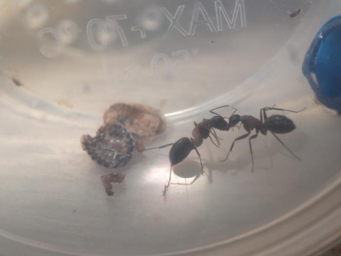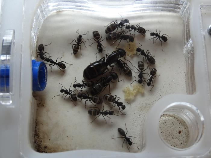 Семья Camponotus ligniperda достигла численности матка и 11 рабочих. Расплод есть, не пожелтевший. Время от времени один или два рабочих фуражируют на мини-аренке-соуснице при умеренном освещении.
